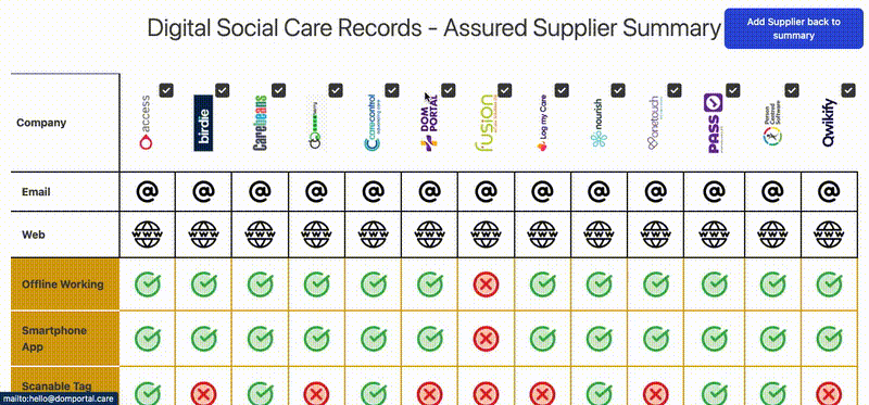 There's currently no funding available for Digital Care Record Systems but we've created a Supplier Comparison Tool which allows you to compare the features of systems listed on the NHS's Approved Supplier List*.Click on the links below to use the tool to view features and compare systems.